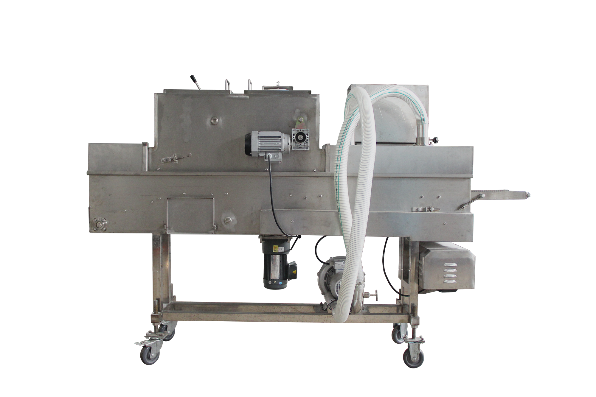裹粉機(jī)能自動(dòng)完成產(chǎn)品的上粉過程,適用于各種預(yù)上粉、混合粉等。產(chǎn)品進(jìn)入下網(wǎng)帶,底部及側(cè)面沾滿粉,從上料斗流下的粉將產(chǎn)品上部覆蓋,經(jīng)壓輥壓緊(上下網(wǎng)帶上的粉厚度可以方便調(diào)節(jié)),上粉后經(jīng)過風(fēng)管,將多余的粉吹落。進(jìn)入下一道程序。