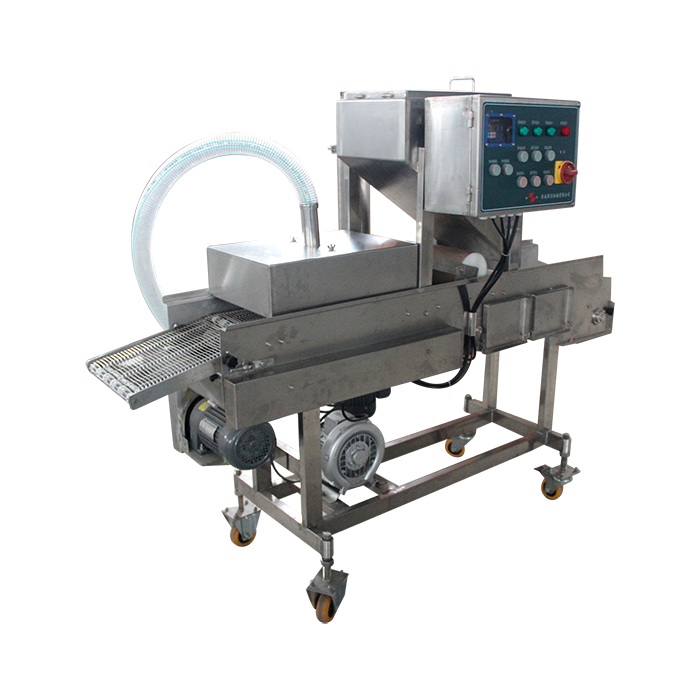 上屑機與上漿機配合使用,裹面包屑機可單獨使用。上面包屑機適合于中等以上干面包糠顆粒,全自動裹康機對市場上流行的漢堡肉餅、麥樂雞塊、魚香漢堡肉餅、土豆餅、南瓜餅、肉串等產(chǎn)品進行上面包屑處理,是快餐店、配送中心、食品工廠理想的上面包屑設(shè)備。