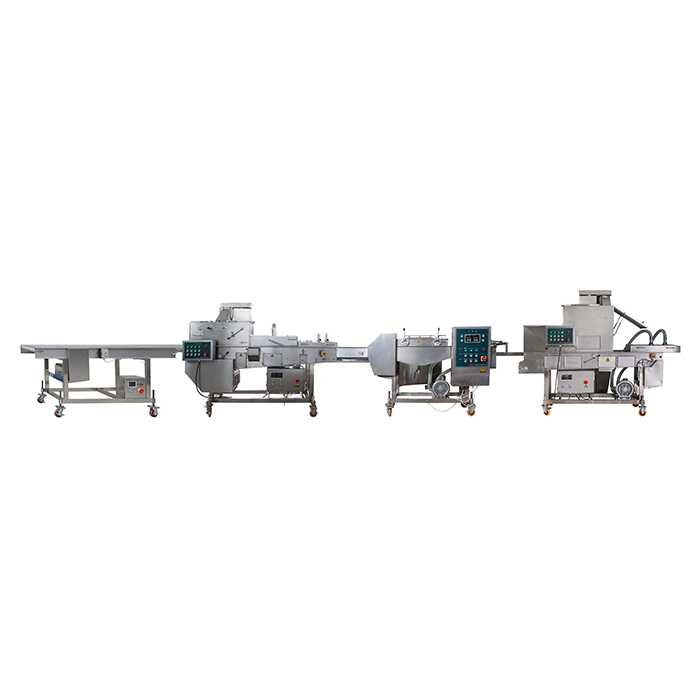 魷魚(yú)圈生產(chǎn)線把切好的魷魚(yú)圈或者其他海產(chǎn)品經(jīng)上粉,上稠漿,上鮮康,油炸,速凍等工藝做出裹粉的炸雞腿。面包蝦生產(chǎn)線的需要配置前處理設(shè)備和后處理設(shè)備:油炸,包裝等設(shè)備,