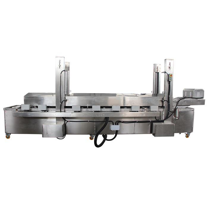 電油炸機是連續(xù)炸物機,食品從機體的進口端輸入后,隨輸送帶在熱油中通過時被油炸熟化,并從機體的出口端輸出。