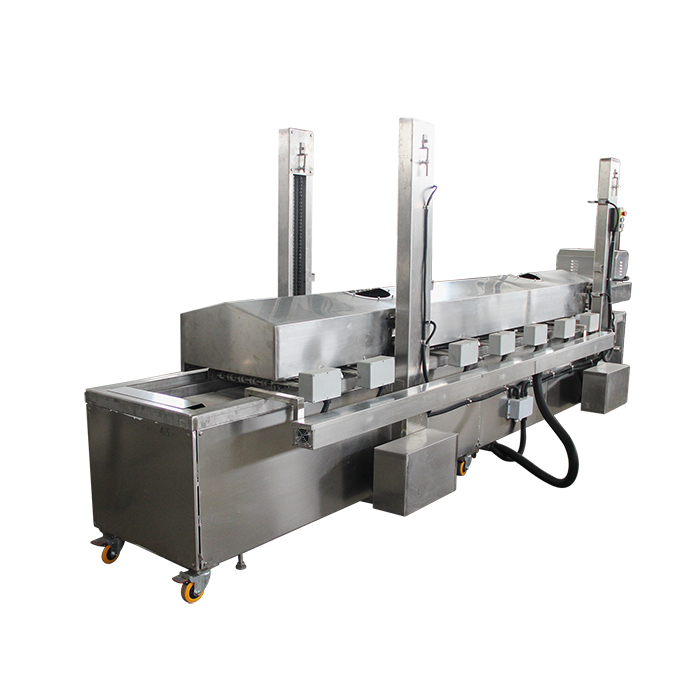 油炸機流水線由網(wǎng)帶輸送系統(tǒng)、自動刮渣系統(tǒng)、濾油系統(tǒng)、網(wǎng)帶提升系統(tǒng)、油溫自動控制系統(tǒng)、電加熱系統(tǒng)等幾部分組成。